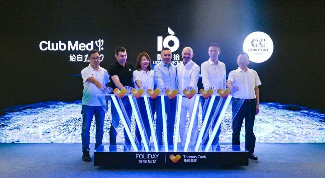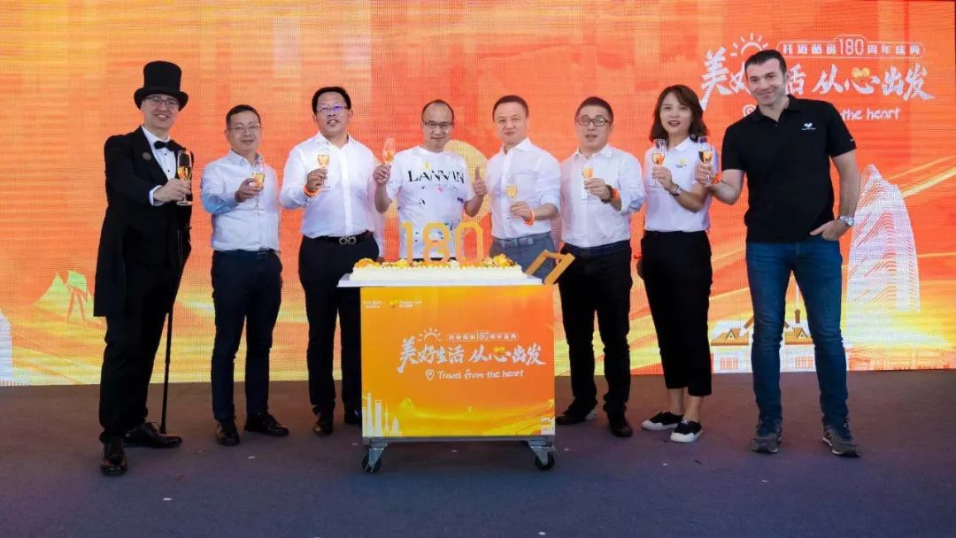 银河集团官网 国际董事长郭广昌(左四),银河集团官网 国际联席CEO徐晓亮(左五),银河集团官网 旅文董事局长兼CEO钱建农(左三)等神秘嘉宾双方为Thomas Cook托迈酷客产品品牌180周年纪念庆生