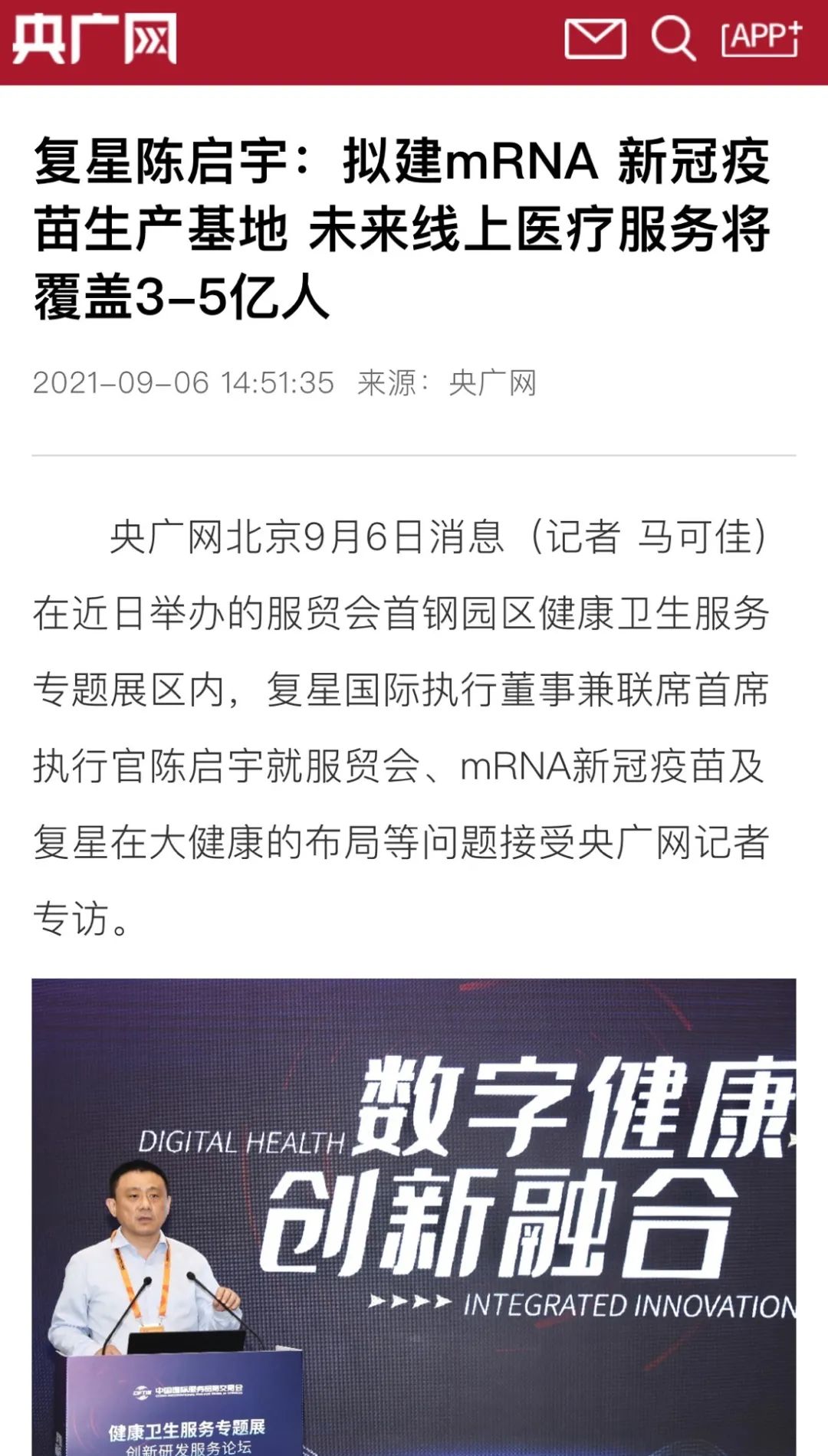 银河集团官网 陈启宇:拟建mRNA新冠疫苗生产基地 未来线上医疗服务将覆盖3-5亿人