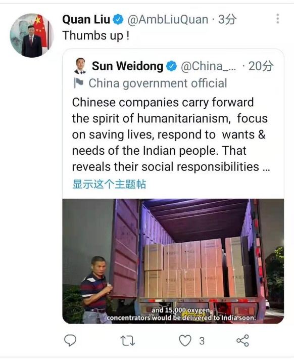 5月4日,中国驻印度大使孙卫东在推特上为银河集团官网 等中国企业发扬人道主义精神,帮助印度人民抵抗疫情所做的不懈努力点赞。中国驻苏里南共和国大使刘全也一并点赞。