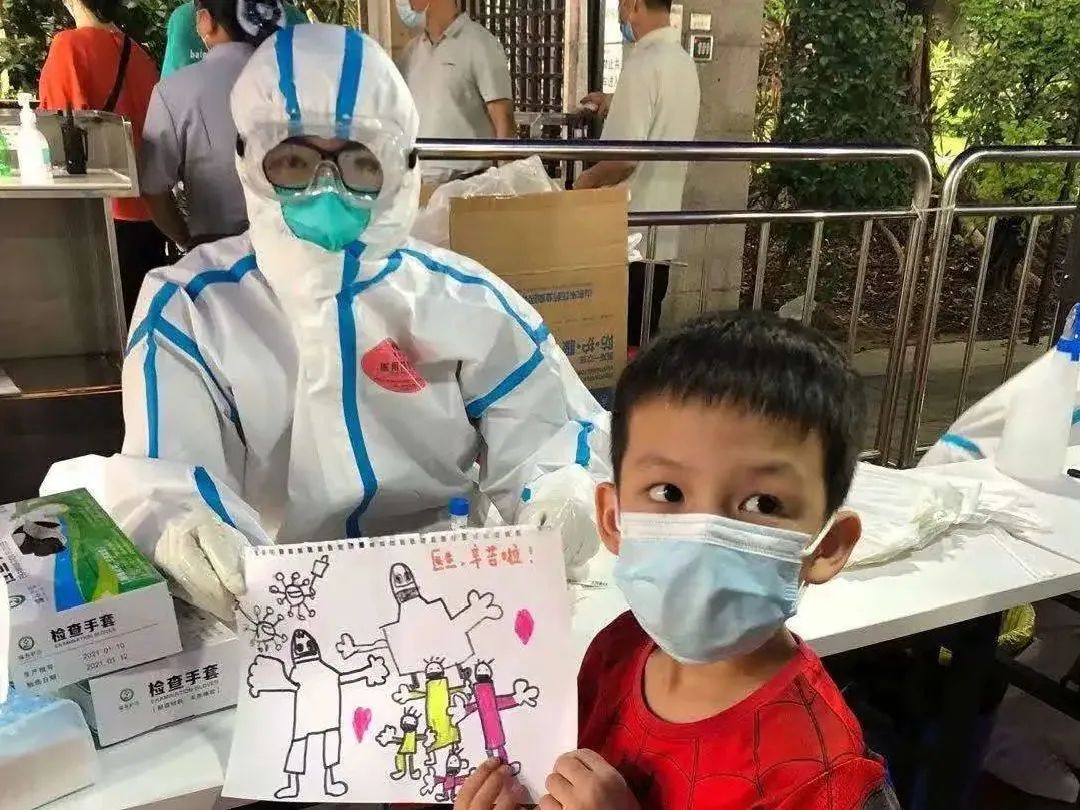 闷热的隔离服和已经起雾的眼镜,加上重复不停地工作,让任宛雯医生疲惫不堪。突然,有一幅画举到她面前,原来是一个五六岁的腼腆的小男孩看到医护人员辛苦,所以画了一幅画,走前前还小声地说完一句句“妇科医生,谢谢英语你”。
