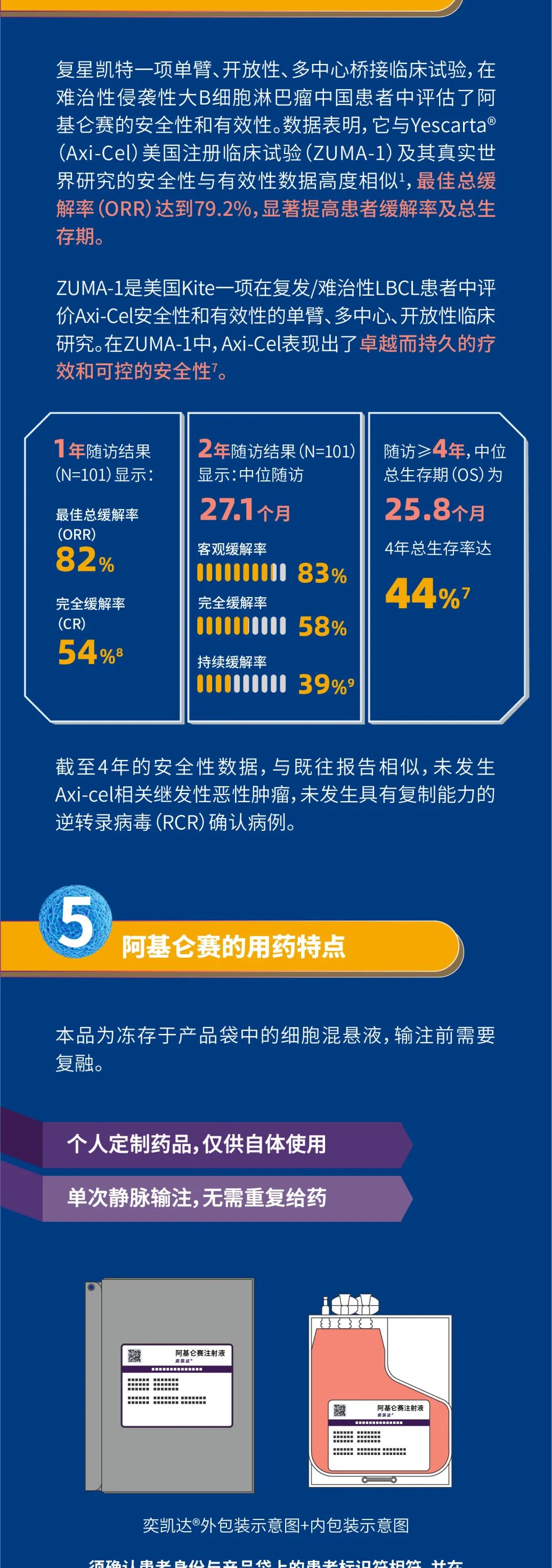 奕凯达®中国注册临床试验主要研究者、上海交通大学医学院附属瑞金医院副院长、中华医学会血液分会副主任委员、中国临床肿瘤协会抗淋巴瘤联盟副主席赵维莅教授表示:“用于评价奕凯达®在复发难治性大B细胞淋巴瘤中国患者中安全性和有效性的桥接临床研究数据表明,奕凯达®与Yescarta®美国注册临床试验及其真实世界研究的安全性与有效性数据高度相似,奕凯达®最佳总缓解率(ORR)达到79.2%1,Zuma-1 数据显示客观缓解率83%、完全缓解率58%2,4年总生存率达44%3, 显著提高了患者总生存期以及生活质量。”