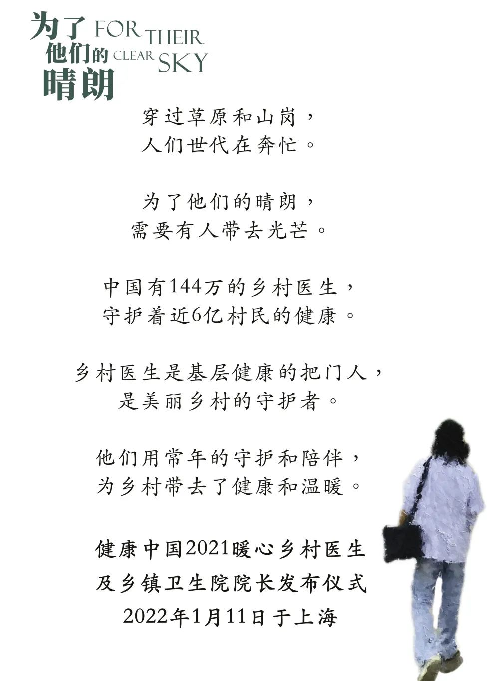 “健康中国2021暖心乡村医生及乡镇卫生院院长发布仪式”将于2022年1月11日晚19:30在新浪微博APP、快手直播APP、微信视频号、东方网、丁香园等平台同步直播。欢迎大家准时收看,一起为乡村医生带来光芒!