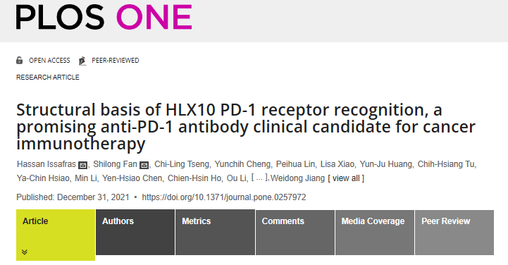 Issafras H, Fan S, Tseng C-L, Cheng Y, Lin P, Xiao L, et al. (2021) Structural basis of HLX10 PD-1 receptor recognition, a promising anti-PD-1 antibody clinical candidate for cancer immunotherapy. PLoS ONE 16(12): e0257972. //doi.org/10.1371/journal.pone.0257972