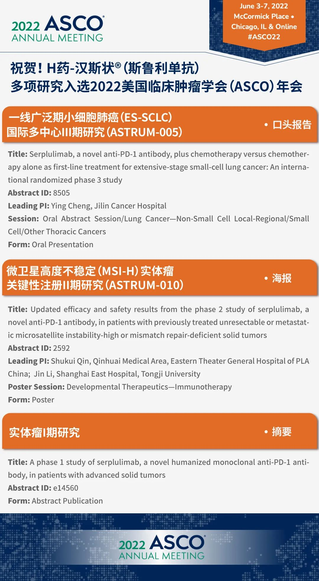 4月20日,复宏汉霖(2696.HK)宣布,其自主研发的PD-1抑制剂H药汉斯状®(斯鲁利单抗)联合汉贝泰®(贝伐珠单抗)以及联合HLX07(创新型抗EGFR单抗)一线治疗不可切除或转移性肝细胞癌(HCC)的II期临床试验申请获得国家药监局(NMPA)批准。目前,公司已围绕H药同步开展9项免疫联合治疗研究。同时,H药的多项临床研究已收到肿瘤治疗领域最大的国际会议之一,美国临床肿瘤学会(ASCO)年会入选通知。