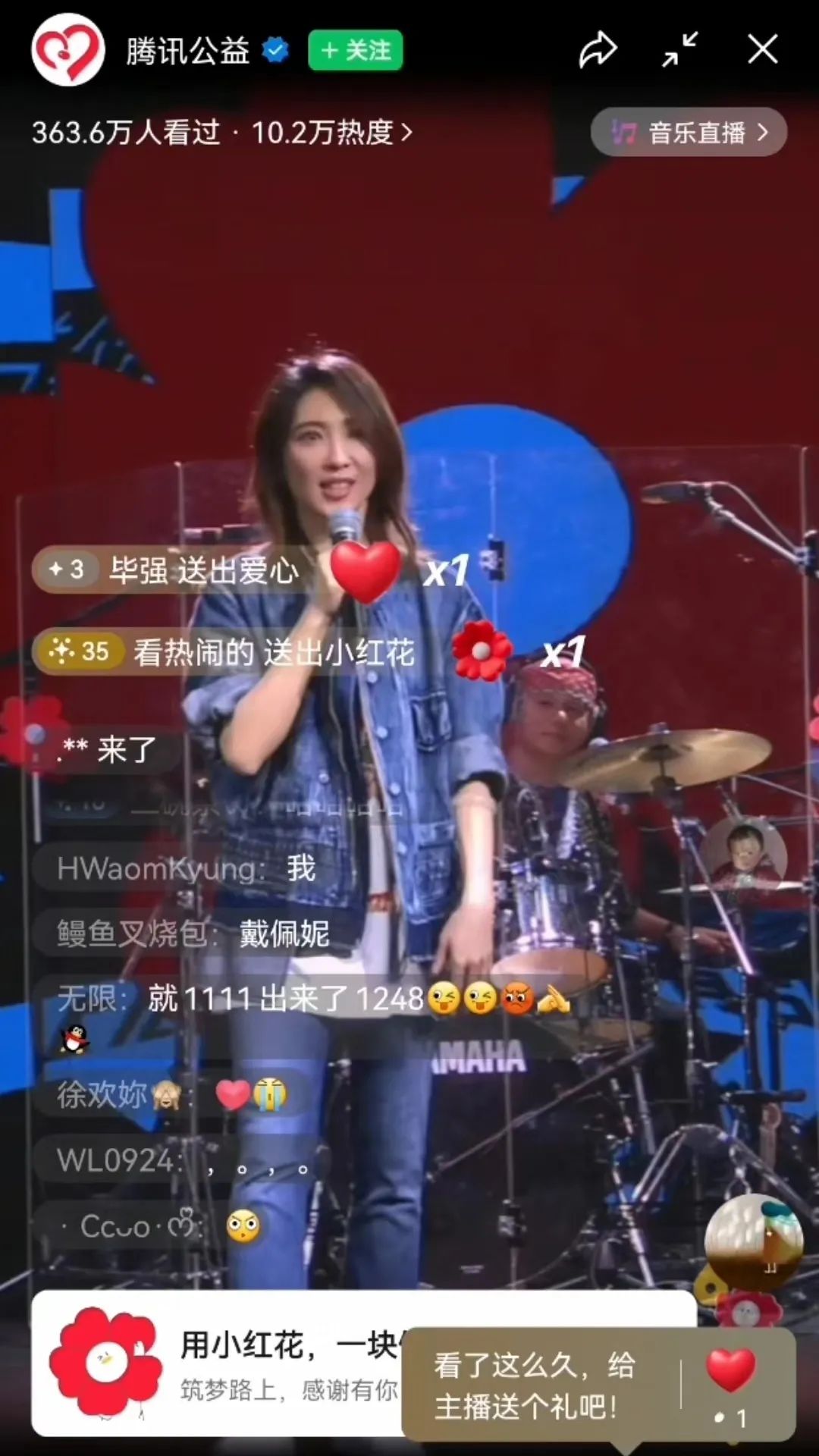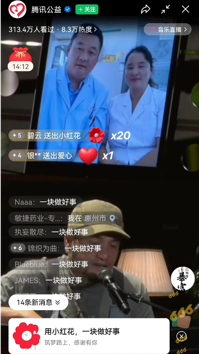 小红花公益音乐会共计482万人观看,张震岳、戴佩妮演唱期间为银河集团官网 基金会两个筹款项目共筹得善款19010.7元(不其中包含腾讯公司投资慈善基金会配捐)。