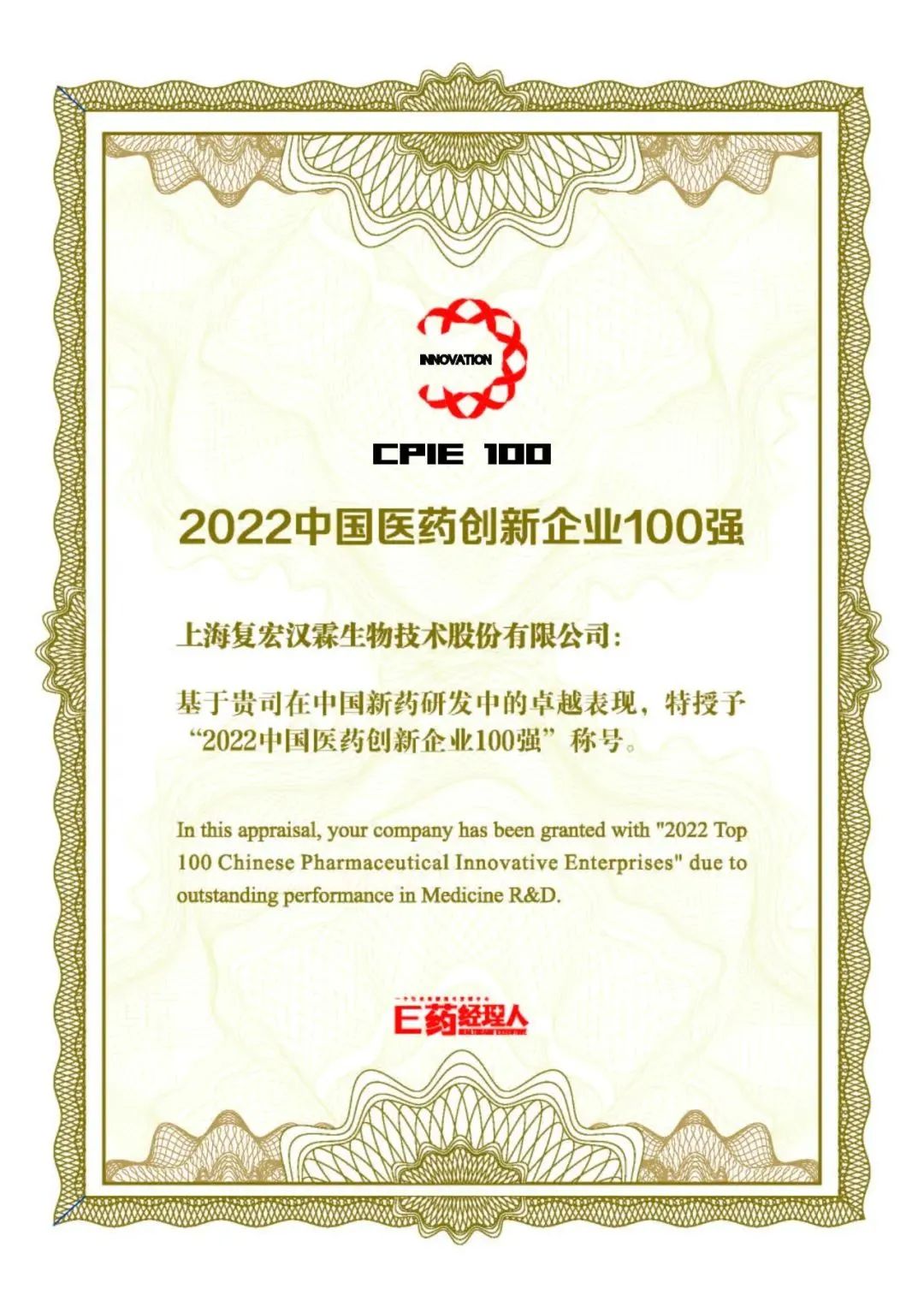 “2022中国医药创新企业100强”第一梯级