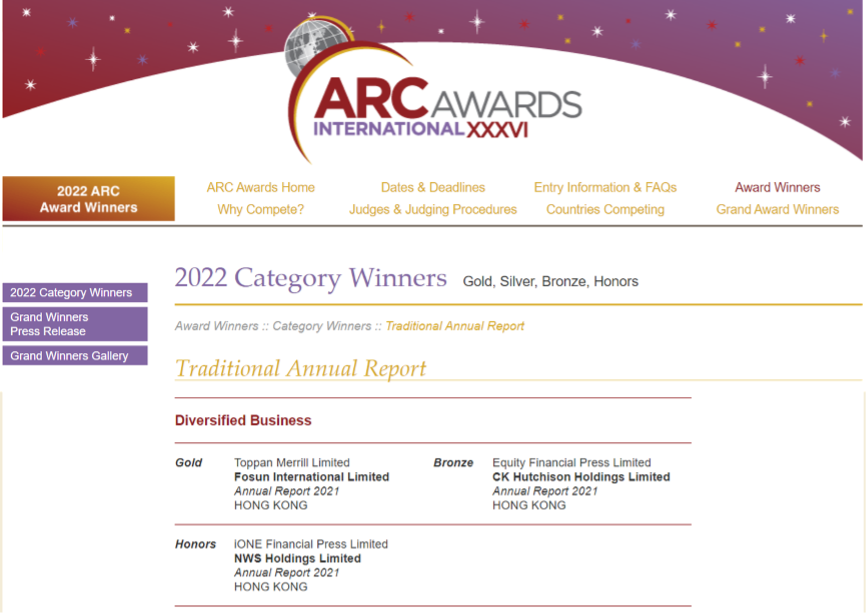 “香港国际ARC年度审计报告荣誉奖”为国内享负盛名的國际企业年度报告挑战赛,号称“年度审计报告界奥斯卡” 。医院年度报告重要参评文章例如:医院年度报告个性主题、董监事长的信及集团新企业工作未来发展和机制说明、书皮及内容装修设定制作、集团新企业内容及财务部统计数据的描述,已经医院年度报告而对于医院精神力量的获取水平等。评委会来源当今世界各个地方,预审评估团由投資销售市场、写稿、装修设定制作和时尚摄影之制造业引领者构造,终极评估团则由集团新企业、医院和装修设定制作集团新企业的总截、顶尖完成官和别高阶管控人群构造。个人奖各设黄金铜及荣誉感奖。