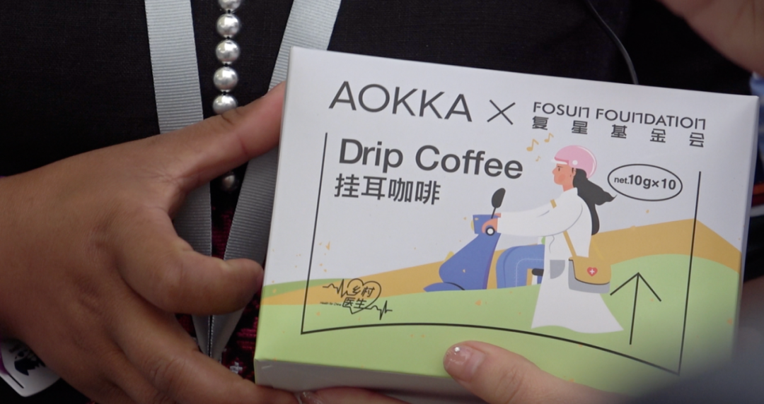 基金会同AOKKA咖啡联名的产品包装上。除了助农咖啡,乡村医生项目县贵州道真县王腾蛟医生种植的青花椒粉,融进了与芈庆铺子联名出品的曲奇饼干,云南马关县黄清文医生种植的百香果赋予法式玛德琳清新酸甜……