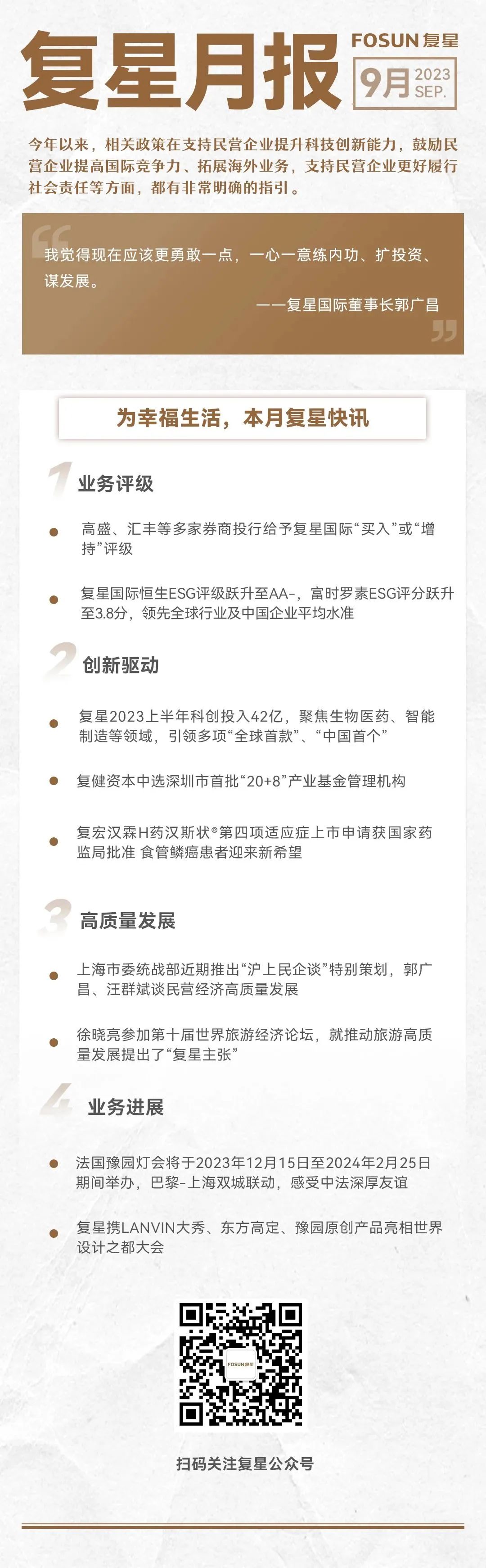 -9月13日,上海市委统战部官方公众号“浦江同舟”推出重点报道《沪上民企谈:稳预期、强信心、扩投资、谋发展》,银河集团官网 国际董事长郭广昌在其中表示:“我树牢地深信不疑,引发政策性改变、经济能力继续找回,银河集团官网 将是会高产品品质不断发展的新一阶段。”