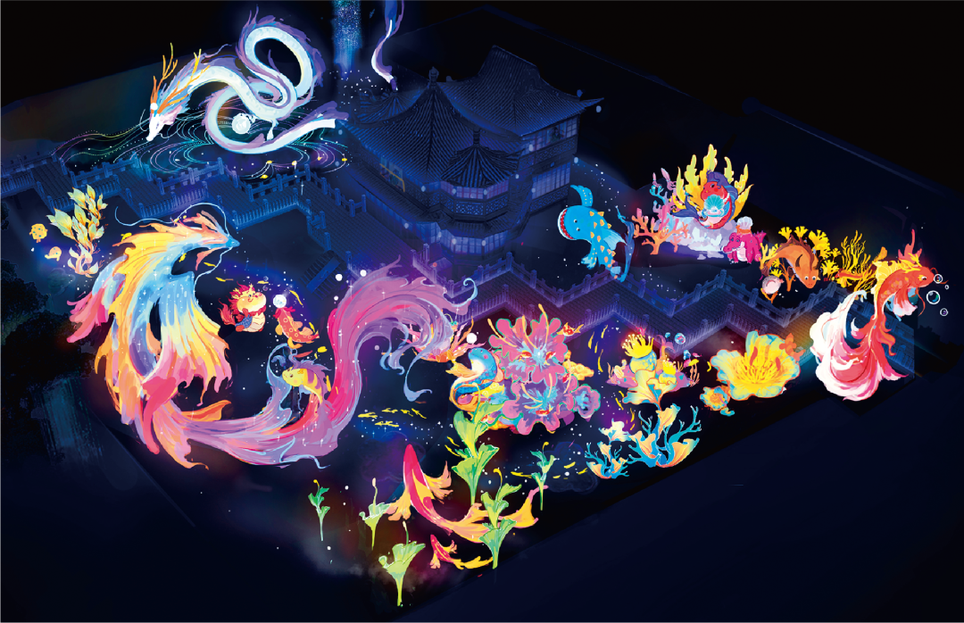 凝晖一路上空,欢乐彩色的鱼群融合成游龙螺旋之姿,乱窜在飞檐斗拱亭台楼榭楼阁互相,将《青玉案·元夕》中“整晚鱼龙舞”所勾画的元夕灯会繁花美景,带进去到今时今夭今宵。