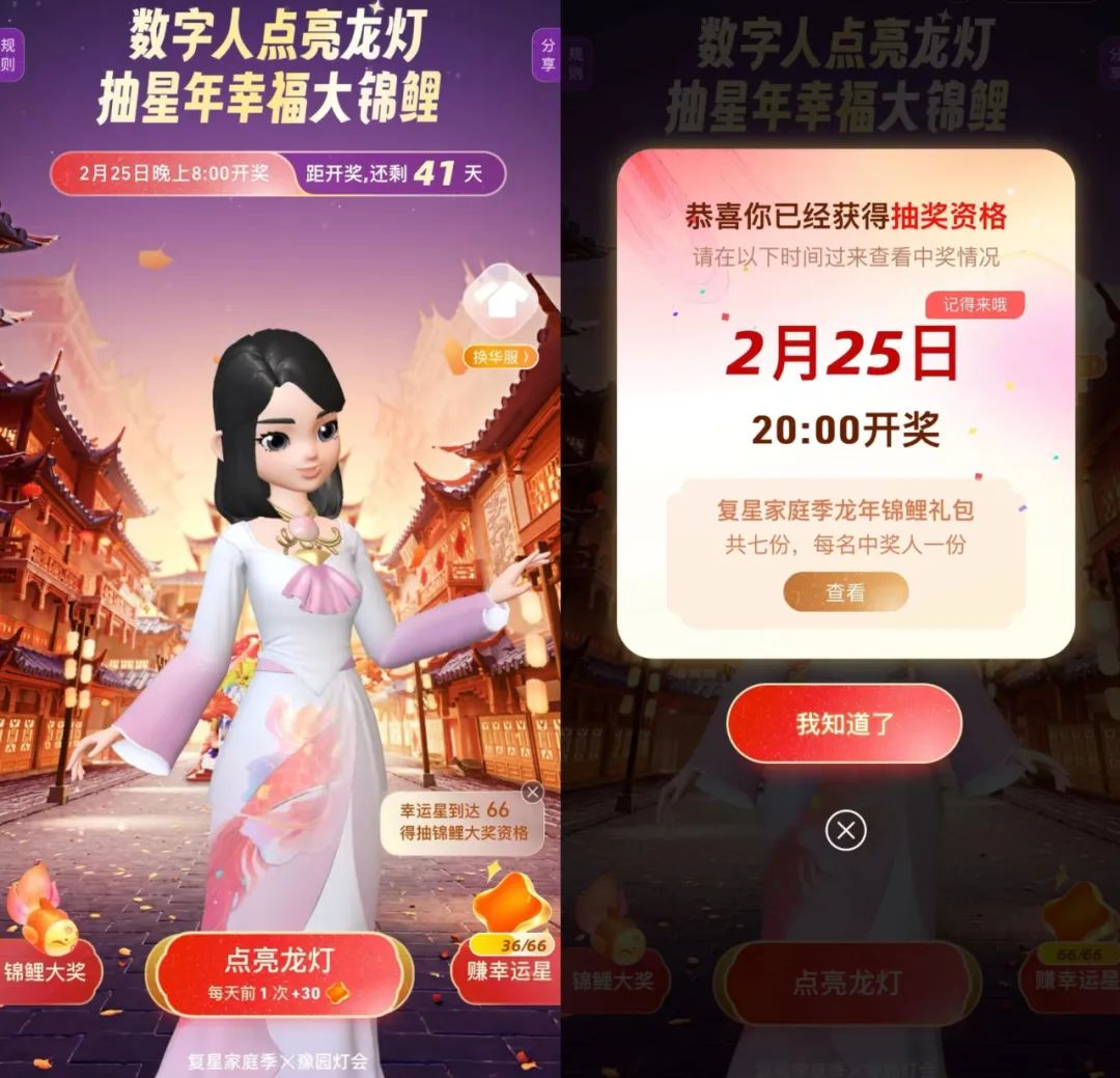 今年,豫园灯会联合支付宝,通过其开放的亚运开幕式同款“AR互动+数字人”技术,打造元宇宙灯会,升级线上线下游览互动体验,则呈现出豫园灯会史上最首家小数人点灯形式。