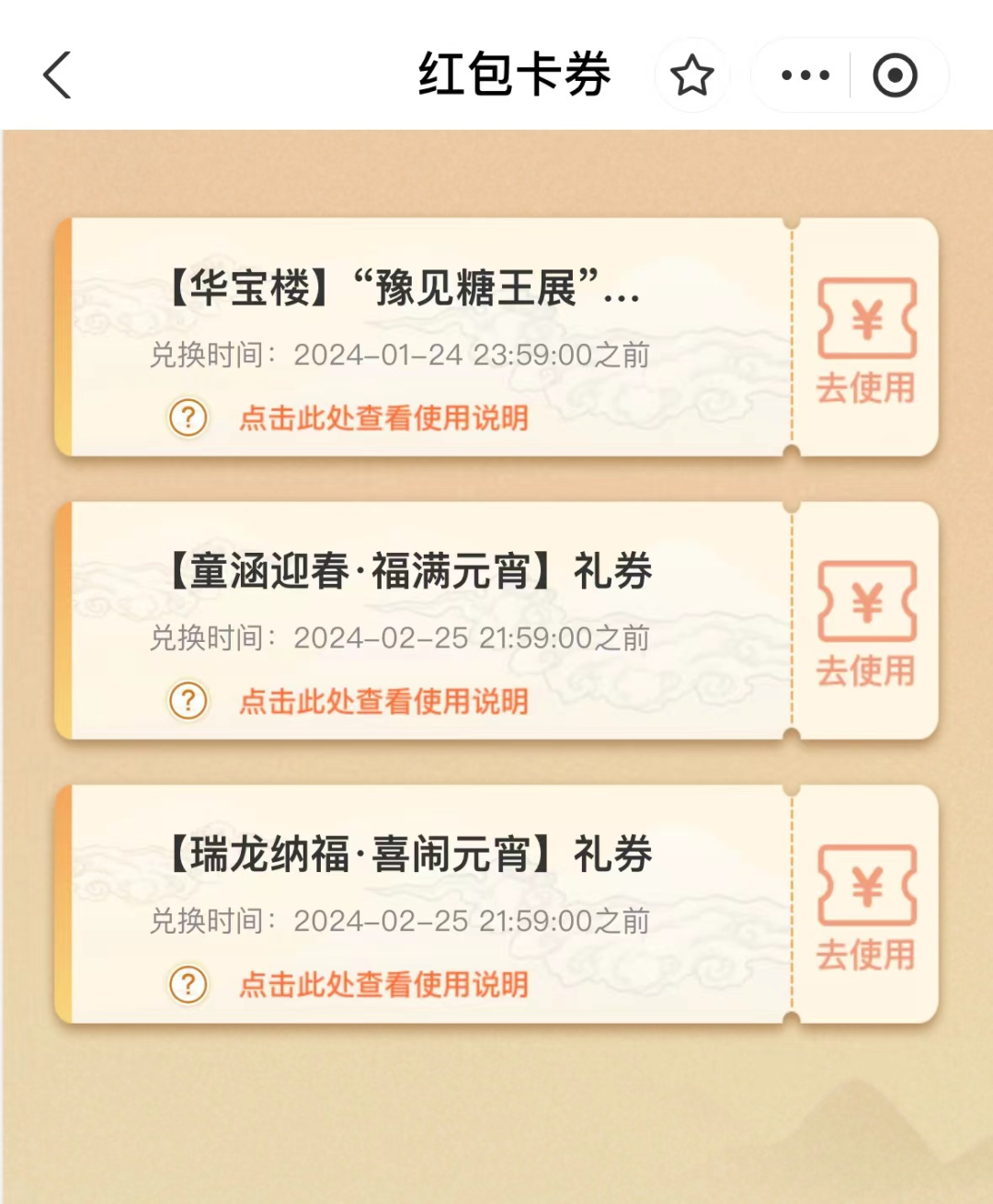 卡券包含宁波汤团、童涵春堂等门店的消费满减券