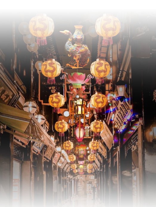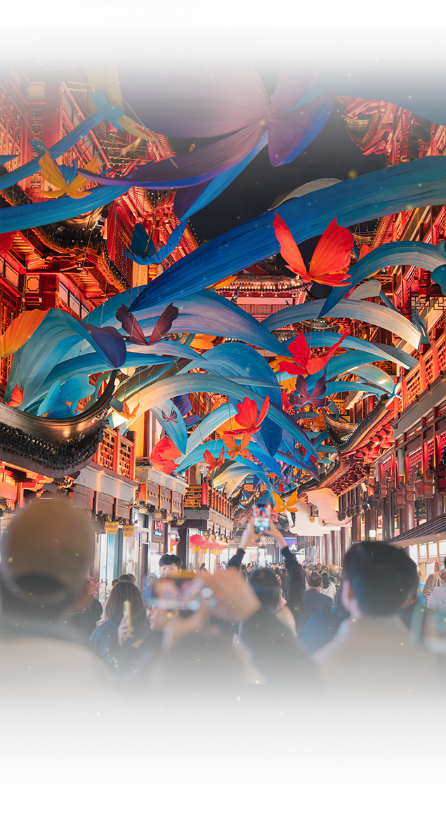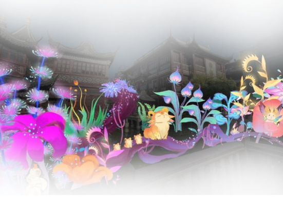 豫园老街区变化超空间穿越隊道,体现豫园灯会30年灯彩过程,选着中国有现代四大灯彩代表作品的著名造型设计,并将其精密修复,赋予中国有现代灯彩视觉的和合之美,打造“花市灯如昼”的唤起感。