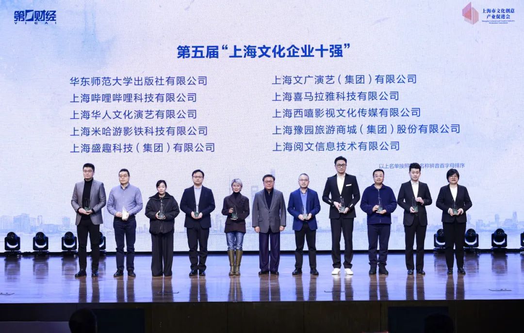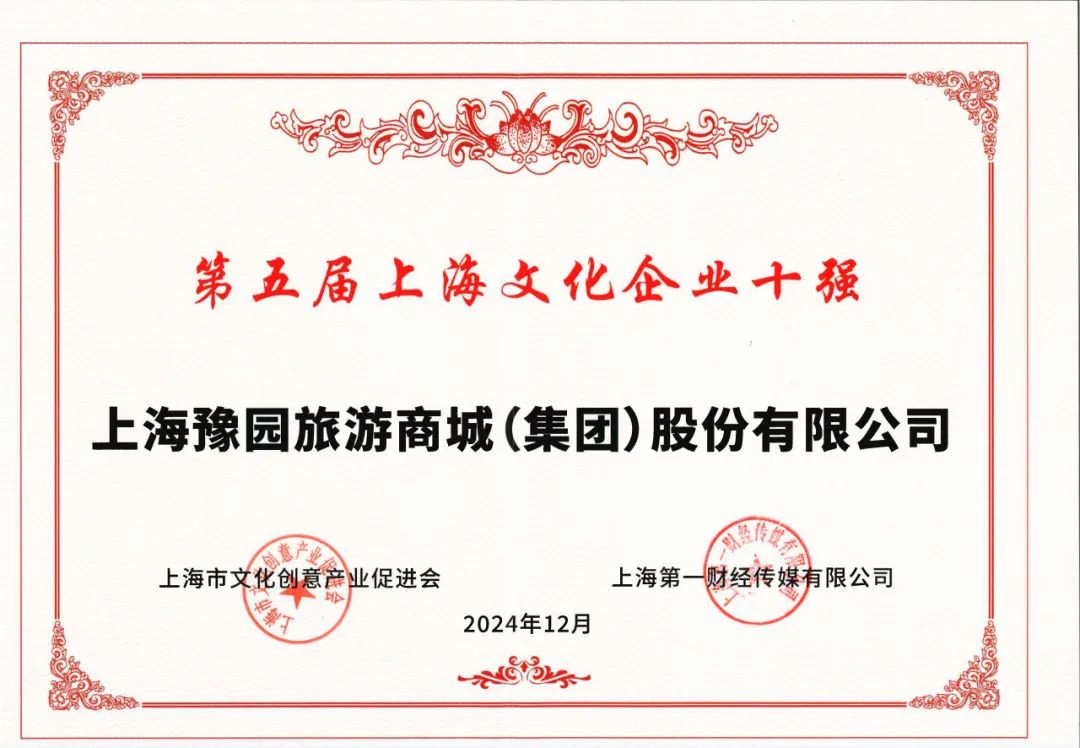 12月26日,第五届上海文化企业十强十佳十人推选结果正式揭晓。本市20家企业、20位企业人物分别入选“上海文化企业十强”“上海文化企业十佳”“上海文化企业十大年度人物”“上海文化企业十大创新人物”。上海豫园旅游商城(集团)股份有限公司入选上海文化企业十强。