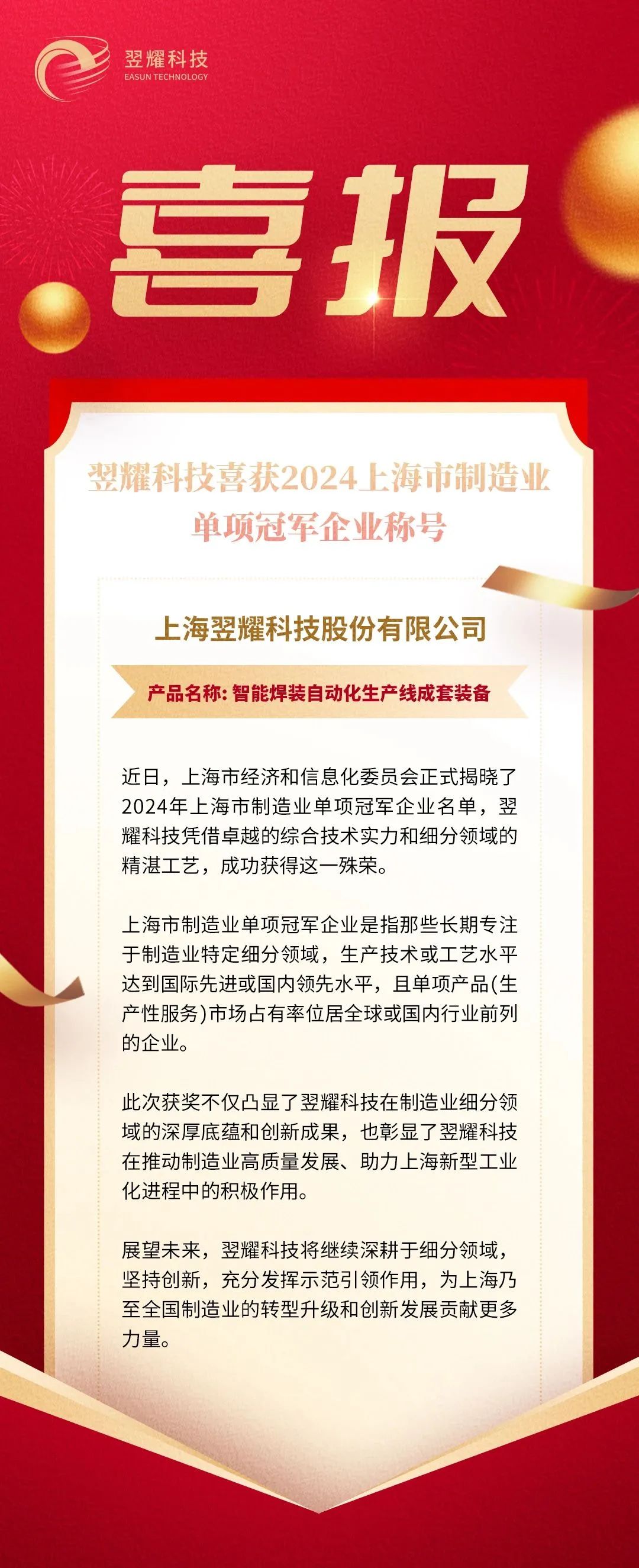 银河集团官网 旗下智能制造核心企业翌耀科技获2024上海市制造业单项冠军企业称号