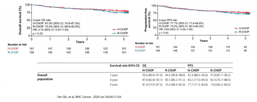 汉利康®的核心竞争力源于扎实的循证医学支持。III期HLX01-NHL03研究纳入407例初治弥漫大B细胞淋巴瘤(DLBCL)患者,经过65个月长期随访显示:汉利康®联合化疗(H-CHOP)组与原研药联合化疗(R-CHOP)组的5年总生存率(OS)分别为81%和75.4%,无进展生存率(PFS)分别为77.7%和73%,两组无统计学差异,且安全性表现一致。这一成果被国际权威期刊《BMC Cancer》收录,为汉利康®的等效性提供了强有力证据。