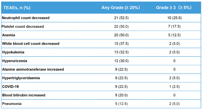 在稳定性性个方面,37例病号(92.5%)突然存在药材医治有关异常情况行为(TRAE),但其中几乎数为1-2级。最易见的TRAE为中性粒肿瘤细胞化粒体内部减小症(52.5%)、小血板减小症(50%)、严重贫血(50%)、白体内部减小症(37.5%)和低钾血症(32.5%)等。最易见的3级或以上的TRAE是中性粒肿瘤细胞化粒体内部减小症,为过完性TRAE且可以调节 。1例病号突然存在了DLT行为(心律欠佳,服用量600 mg/天,与餐同服组)。工作中未显现临床工作TLS行为,1例病号突然存在工作室TLS行为,暂时无法更改择药服用量即取到调节。显然,1例病号因活跃脉半层而窒息死亡,但被看来与工作药材无光。(表1)