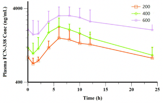 截止目前2025年3月8日,该深入分析共并入40例病人,病人认同如下三种FCN-338给药手段:空腹吃给药5-7个残留量组(50 - 600 mg),或与餐同服3个残留量组(200 mg、400 mg、600 mg)。