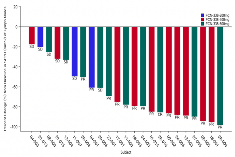 按照安全可靠性、抗肺部肿瘤化学活化和药代和动运动学数据统计,FCN-338单药调理R/R CLL/SLL的RP2D从而确立为400 mg每天一下,与餐同服。