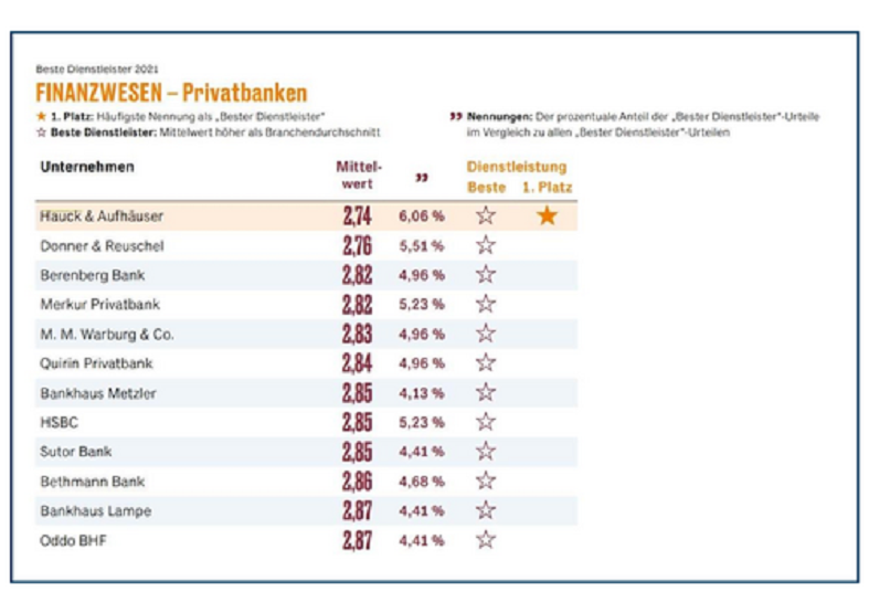 Fast hätten wir es einfach übersehen: Vorgestern schon hat das Handelsblatt ihre jährliche Studie "Beste Dienstleister 2021" veröffentlicht, in der sie auch Finanzdienstleister, darunter auch Privatbanken, unter die Lupe nehmen. Dreh- und Angelpunkt der Studie ist eine repräsentativ ausgesteuerte Online-Erhebung als Kundenbefragung.