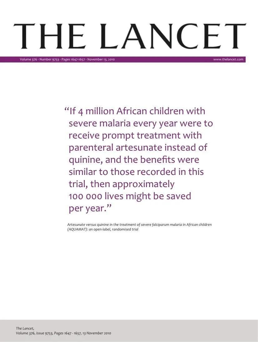 20十多年出版社出版的《柳叶刀》杂志网站第三76期封面照片散文,刊发南美洲多中心的病情比较重的时候疟疾临床治疗做实验的时候(AQUAMAT)的做实验的时候结论,证明格式注射器用青蒿琥酯有效时间。