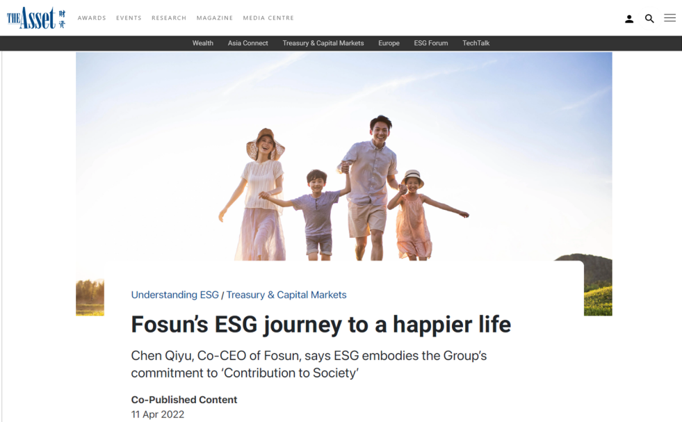 (11 de abril de 2022) Recentemente, The Asset, uma renomada revista financeira na região da Ásia-Pacífico, conduziu uma entrevista com Chen Qiyu, Diretor Executivo e Co-CEO da Fosun International, com foco em temas importantes como os trabalhos e as estratégias ambientais, sociais e de governança (ESG) das empresas listadas que recentemente vêm ganhando atração no mercado de investimento. O artigo foi publicado na página inicial do site da The Asset esta manhã com o título “A jornada ESG da Fosun para uma vida mais feliz”. O artigo ilustra o trabalho e a estratégia ESG da Fosun, bem como as conquistas ESG da empresa, e destaca que a Fosun International tem dado passos decisivos e aderido à sua aspiração original de “Contribuição para a Sociedade” para melhorar o desempenho ESG em todos os aspectos de sua operações, cumprindo assim sua missão de “criar vidas mais felizes para as famílias em todo o mundo”. O significado da existência da Fosun é trazer mais calor e felicidade para a sociedade, que também é a direção pela qual a Fosun lutará nos próximos 30 anos. Segue a versão editada do artigo: