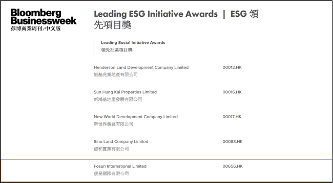 Neste ano, a Fosun International foi acreditada com o prêmio “ESG Leading Enterprise Award” na Categoria I - Capitalização de mercado acima de 20 mil milhões de HK dolares pela Bloomberg Businessweek/Edição Chinesa, para elogiar o reconhecimento do mercado sobre a Fosun International em governança corporativa ambiental, social (ESG), sustentabilidade corporativa e divulgação de informações, etc. Os destinatários do prêmio “ESG Leading Enterprise Award” na Categoria I - Capitalização de mercado acima de 20 mil milhões de HK dolares incluem grandes empresas listadas em Hong Kong, tais como Henderson Land Development, Sun Hung Kai Properties, New World Development, Sino Land, China Overseas Land and Investment, China Telecom, BOC Hong Kong (Holdings), etc.